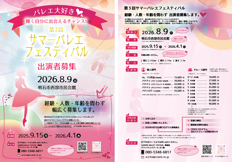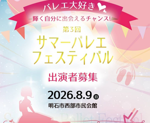 コンクールのページを更新しました! 2025年8月17日(日) 第3回サマーダンスフェスティバル 参加者募集! お問合せ・参加のお申し込みは こちら から。 |